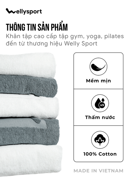 - Khăn tập cao cấp tập gym, yoga, pilates đến từ thương hiệu Welly Sport được thiết kế với chất liệu 100% Cotton, dày dặn, mềm mịn